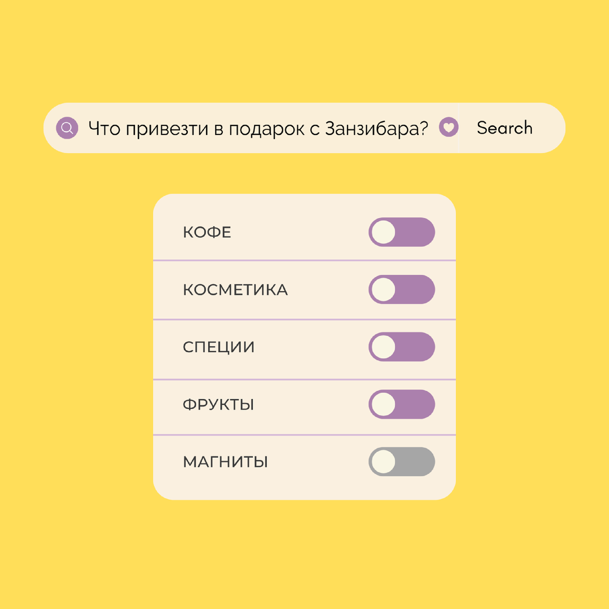 Вот вам мой список подарков из путешествия: Кофе ☕️ Сейчас множество вариантов на любой вкус - и в зернах и молотый. Появилось много красивых подарочных упаковок. Можно найти хорошее зерно в кафе, вам на нем еще и сварят, чтобы протестировать. Местная косметика 🧴 Есть довольно крупные местные бренды, типо «Inaya». У них будут и красивая упаковка и отличная косметика. Люблю у них мыло - идет в тканевых мешочках. Также появляется все больше локальных маленьких производств. Например, в нашем кафе мы продаем мыло на основе кофе и различных специй от небольшого проекта по переработке. Фрукты 🥭 Тут есть лайфхак для маракуйя - берете зеленую маракую прям в день вылета домой. По дороге она доспевает, и вы кладете ее в морозилку. Теперь она сохранится очень надолго. Папайю вести не стоит, скорее всего, доедет каша. Ну, и дуриан я бы тоже не брала, но тут уже из-за запаха. Специи 🫚 Занзибар, кстати, называют островом специй. И специи тут действительно отличные. Но! Не берите их в