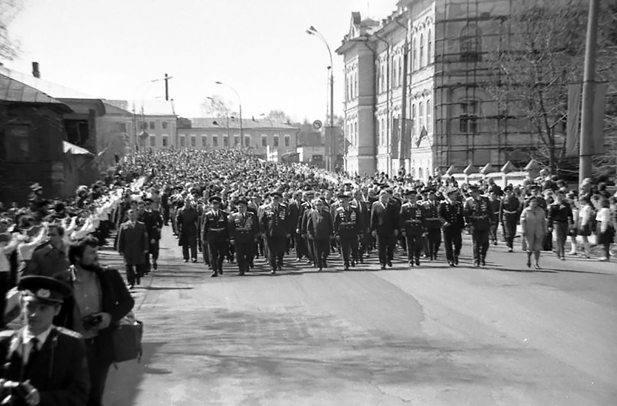 9 мая 1985 года. Колонна движется с площади Революции по улице Чернышевского к воинскому кладбищу, где после официальных слов будет заложена капсула времени к потомкам. Её разместят в нише памятника павшим за мраморной плитой с надписью «Здесь заложена капсула с обращением ветеранов Великой Отечественной войны 1941-1945 годов к вологжанам 2000 года».
