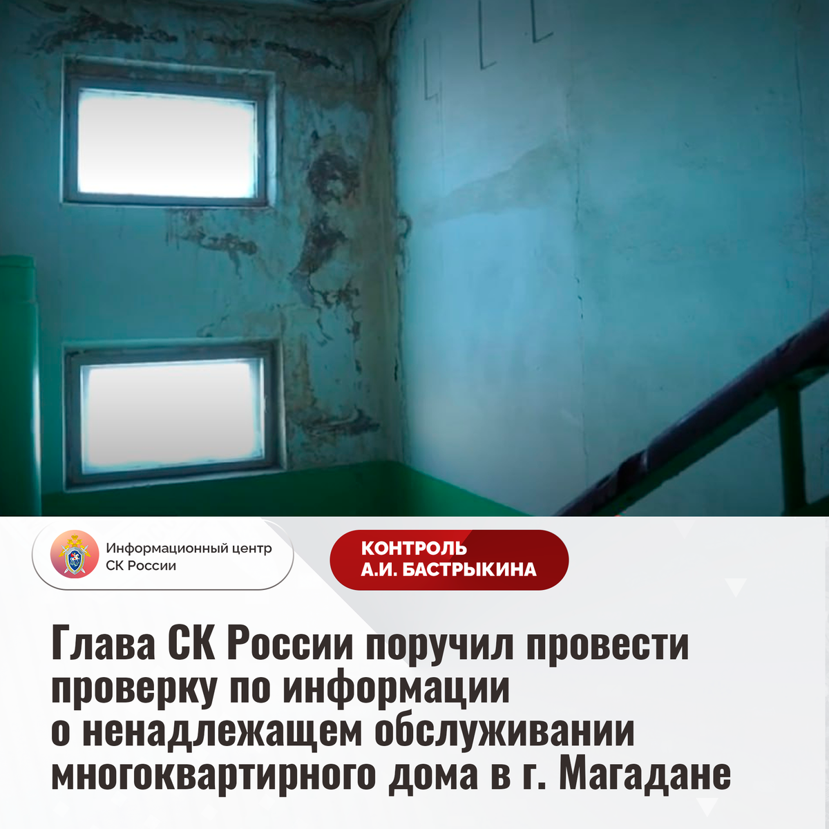 Глава СК России поручил провести проверку по информации о ненадлежащем обслуживании многоквартирного дома в г. Магадане В СМИ сообщается о ненадлежащем обслуживании многоквартирного дома по улице Ямской в городе Магадане. Длительное время кровля здания, 1987 года постройки, протекает, инженерные системы неисправны, что приводит к затоплению подвала и жилых помещений нечистотами, образованию сырости и плесени. Обслуживание общедомового имущества не осуществляется. Многочисленные обращения граждан, в числе которых пенсионеры, в управляющую компанию и профильные службы результатов не принесли, аварийным дом не признан, в связи с чем они вынуждены проживать в небезопасных условиях. Председатель Следственного комитета Российской Федерации Александр Иванович Бастрыкин поручил руководителю СУ СК России по Магаданской области Александре Викторовне Просиной провести процессуальную проверку и представить доклад о ее предварительных и окончательных результатах. Исполнение поручения, а также ход п