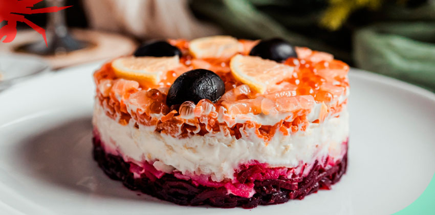Ингредиенты: Для начала отвариваем овощи: свёклу, картофель и морковь. Даем им остыть. Овощи натираем на крупной тёрке. Картофель смешиваем с майонезом. Нарезаем рыбу небольшими кусочками. В салатник или на тарелку через кольцо выкладываем слоями свёклу, картофель, морковь. Сверху сделаем сеточку из майонеза, выкладываем красную рыбу. Украшаем икрой, ломтиками лимона и половинками маслин. Блюдо готово. Приятного аппетита! Источник: https://wildcrab.ru/news?id=2632