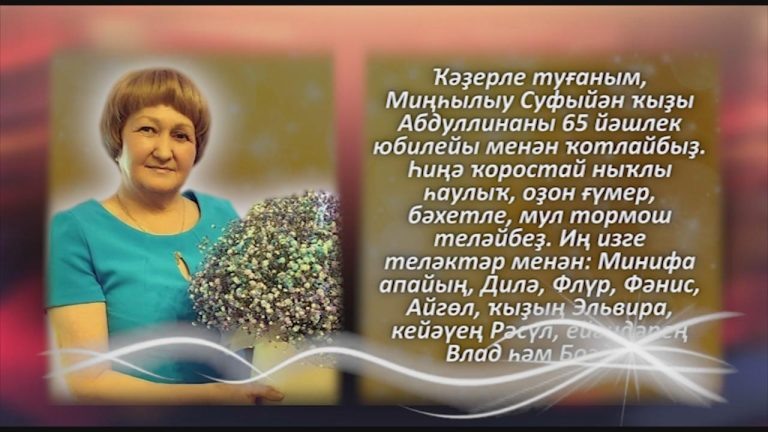 Ҡәҙерле туғаным, Миңһылыу Суфыйән ҡыҙы Абдуллинаны 65 йәшлек юбилейы менән ҡотлайбыҙ. Һиңә ҡоростай ныҡлы һаулыҡ, оҙон ғүмер, бәхетле, мул тормош теләйбеҙ. Иң изге теләктәр менән: Минифа апайың, Дилә, Флүр, Фәнис, Айгөл, ҡыҙың Эльвира, кейәүең Рәсүл, ейәндәрең Влад һәм Богдан