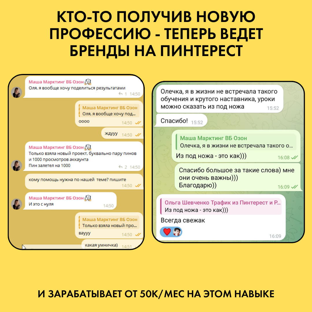 Вы когда-нибудь видели, как обычная картинка превращается в поток клиентов? На Pinterest такое — ежедневная магия. И самое крутое: эта площадка бесплатна. Возьмем Машу. Она только начала вести бренды на Wildberries и Ozon. Сделала пару пинов — и через пару дней ее аккаунт собрал 1000 просмотров. Машенька не только ведет бренд (от которого у меня и училась), она еще взяла совсем иную нишу и стала работать как Менеджер Пинтерест (как и я сама работаю с брендами) И пришла ко мне на Наставничество по продвижению на Пинтерест. Опытный Менеджер (с твердыми кейсами) - берет: 1-ый месяц 30-35 тр 2-ой месяц 20-25 тр. А теперь посчитайте, сколько вы будете зарабатывать, тратя пару часов в день, имею 4-5 клиентов? А если еще добавить сюда Консультации??? Новички берут от 10 до 20 тр с одного клиента. Чем больше появляется кейсов, тем выше ЧЕК! Вот что говорят те, кто прошел этот путь: «Уроки «из-под ножа», всегда актуально и без воды». «Обратная связь — бесценна. Ты не просто покупаешь ку