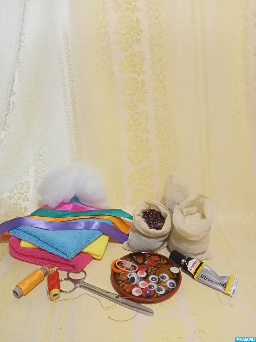 Цель: Завести речь детей с помощью игр Марии Монтессори. Задачи: 1. Познакомить родителей с методами работы М. Монтессори для развития речи детей. 2. Научить родителей делать игрушки из подручных материалов, наполнять их разными наполнителями. 3. Развивать речь детей с помощью тактильных ощущений, развивать мелкую моторику рук. Материал: 4 кухонных салфетки разного цвета, резиночки, ленточки, 4 мешочка из ткани, для наполнителя: рис, фасоль, горох, синтепон, нитки, иголка, ножницы, глазки, рот, клей. Ход работы: 1. Взять кухонную салфетку (30х30см, сложить, отогнуть слева и справа по 9см, в середине – 11см. 2. Верхние уголки сложить, закрепить резинкой и расправить (ушки). 3. Вложить внутрь синтепон (для головы, закрепить резинкой. 4. Заранее подготовить мешочек из тонкой ткани (10х14см, насыпать в него рис, завязать (в другие мешочки насыпать горох, фасоль). 5. Вложить мешочек в салфетку, верхнюю часть мешочка завести под резинку, которая закрепляла "голову". 6. Нижние края салфетки з