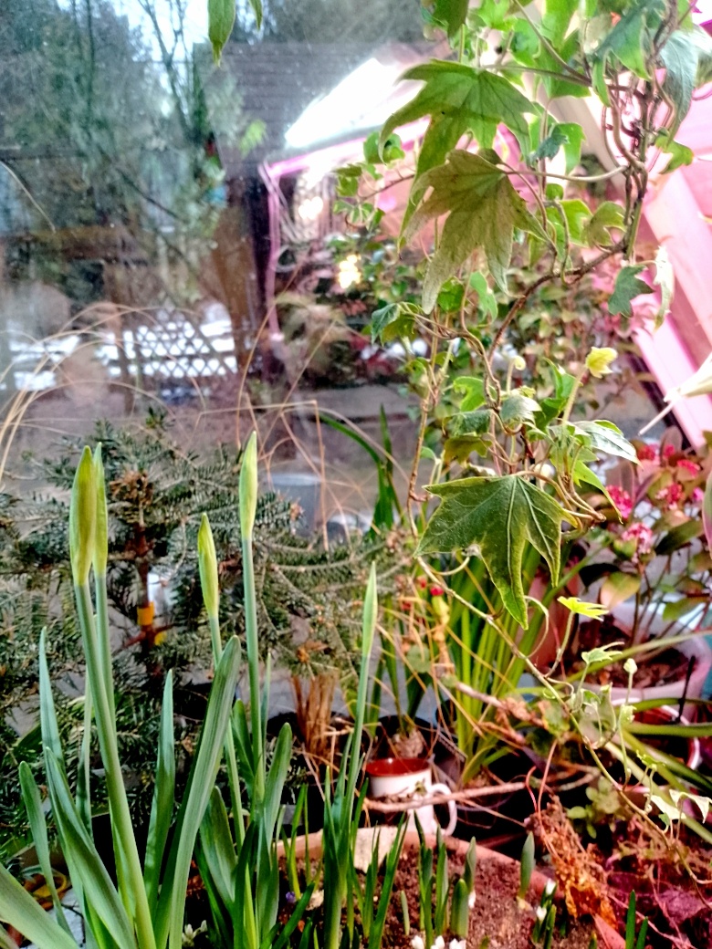 На улице продолжается все та же маета, даже не хочется выходить. Зато в зимнем саду у нас вовсю весна! Вот-вот распустятся нарциссы и тюльпаны. Хвойные, которые зимуют в помещении надувают почки. Вылезают многолетники Вот куда спешат эти торопыги?!! Мне приходится постепенно, по мере того, как они просыпаются, выставлять их на свет. И места в зимнем саду становится все меньше. А еще ведь есть посевы! Вечнозеленая калина лавролистная (Viburnum tinus) Гвеннлиан (Gwenllian) радует меня все больше! Она идеальна для горшечной культуры. Цветёт несколько раз в год, если ей позволить, хорошо завязывает плоды, которые полностью вызревают. Прекрасно стрижется и быстро нарастает. Подробнее о ней можно прочитать здесь: Единственное, ей, похоже недостаточно света в зимнем саду. Бутоны, так же, как и цветы, белые. Попробую переставить под более яркую лампу. Бутоны остаются белыми при недостатке света. Летом, на улице, они очень нарядно окрашиваются от розового до красно-фиолетового. Кстати, в
