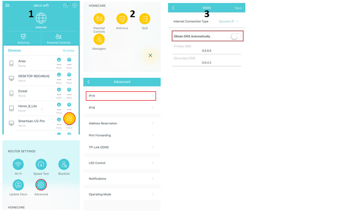 В ряде случаев пользователям Deco может понадобиться настроить собственный DNS-сервер (например, Google DNS 8.8.8.8, Cloudflare 1.1.1.1 или собственный локальный DNS). Эта инструкция объясняет, как изменить DNS-настройки в мобильном приложении Deco. Важно помнить, что корректность работы сети и скорость доступа к сайтам во многом зависят от используемого DNS. Ниже приведены подробные пошаговые указания, а также дополнительные рекомендации, которые помогут избежать типичных ошибок (например, ситуация, когда доступ к DNS отсутствует и ваш интернет перестаёт работать). Примечание: Закрытие приложения и переподключение к Deco часто помогает избежать ситуации, когда данные кэшируются, и изменение DNS не отображается. Совет: Если вы часто сталкиваетесь с проблемами доступа к сайтам, протестируйте несколько разных DNS-серверов, чтобы выбрать самый надёжный и быстрый. Смена DNS-сервера в Deco — процедура быстрая, но требующая аккуратности при вводе IP-адресов и соблюдения условий (подключение