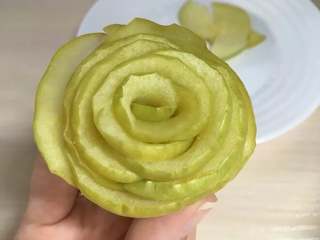 Нарезаем яблоко пополам, убираем семена. Теперь режем яблоко тонкими полукружьями. Можно сделать их мягче, прогрев в микроволновке 2−3 минуты на высокой мощности.