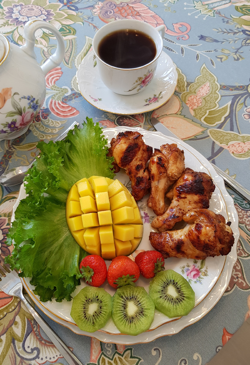 Выложить на тарелки промытые листья салата, манго, киви, клубнику и запеченные крылышки. Приятного аппетита!