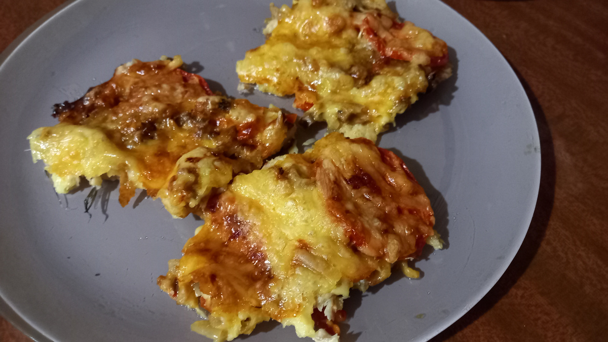 Берем филе хека, солим, перчим. Нарезаем порционными кусочками. Выкладываем их в блюдо для запекания шкурой вниз. Шампиньоны нарезаем на слайсы и обжариваем вместе с репчатым луком. На рыбу выкладываем грибную начинку, затем кружочки помидор. Все посыпаем тертым сыром. Ставим в духовку до готовности.