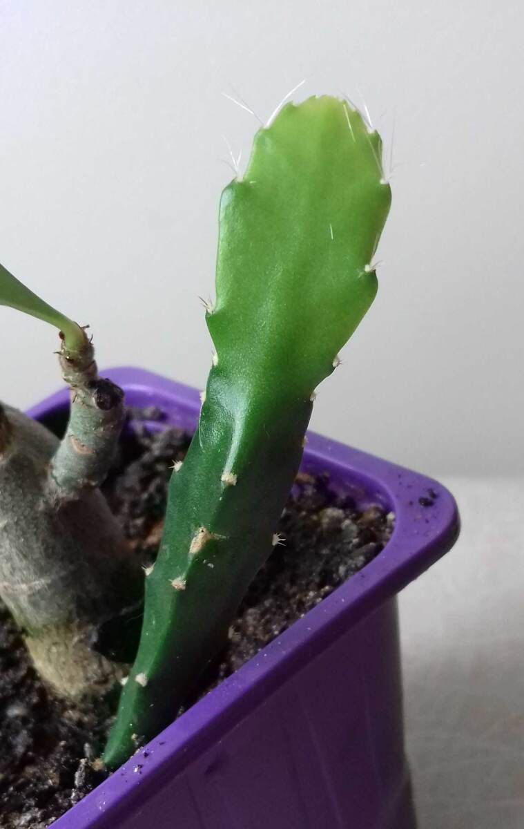 После первого успеха я решила поискать другие расцветки. На одном из летних свопов я обменяла черенок розового эпифиллума на черенок красного. Да, цветения от него ждать долго. Но теперь это неважно, ведь у меня есть кем любоваться. А может, весной совершу вылазку в магазинчик при ботаническом саду. С лета черенок укоренился, удлинил первый лист, выпустил ветку и маленькую детку из под земли. Хорошо себя проявил, в общем.