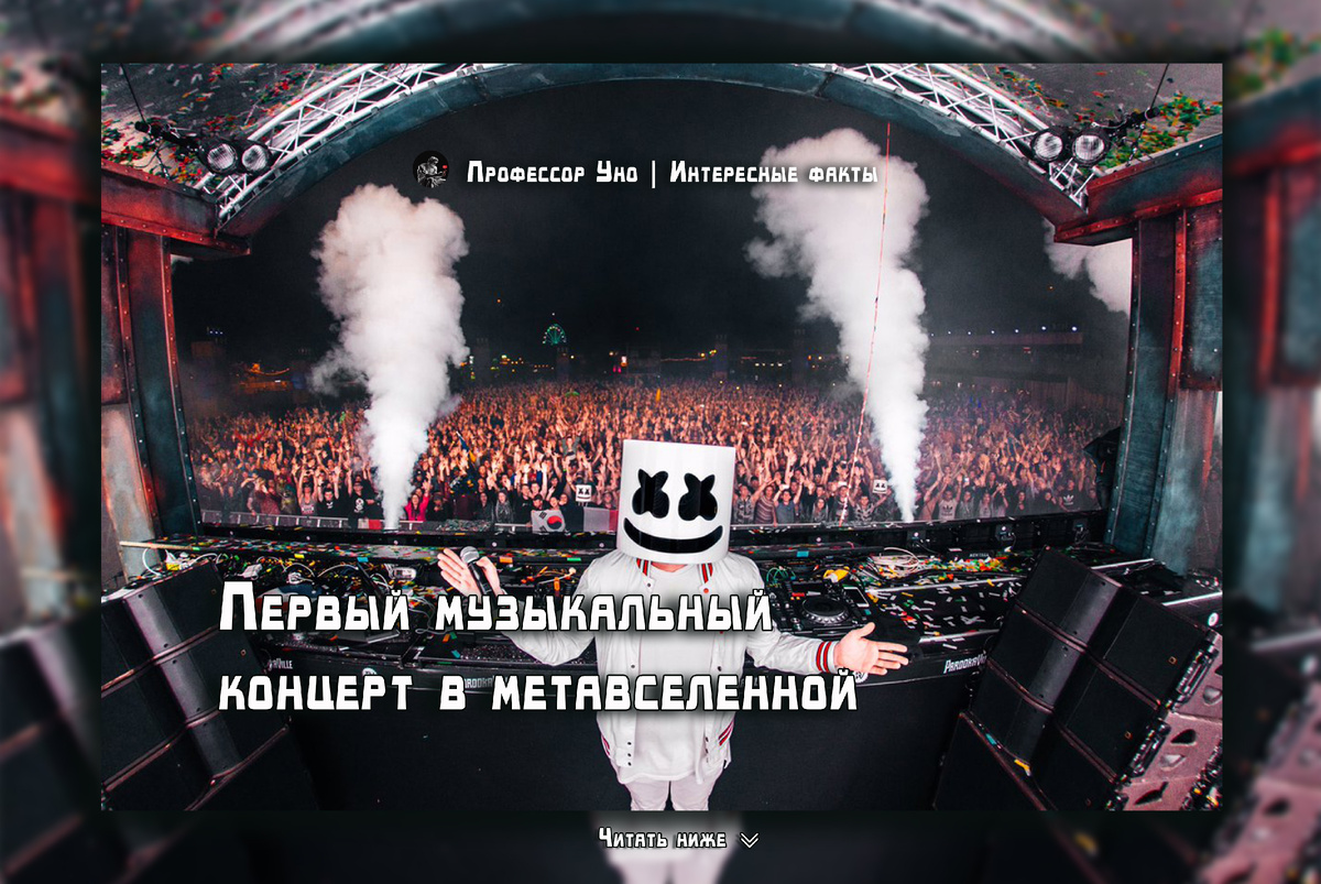 А вы знали, что первый музыкальный концерт в метавселенной прошёл в 2019 году? Популярная онлайн-игра - Fortnite, организовала шоу с участием известного диджея Marshmello, которое собрало более 10 миллионов зрителей. Это был настоящий прорыв в мире виртуальных развлечений. Для концерта Marshmello “построили” специальную площадку, куда могли попасть все желающие. Сам концерт шёл 10 минут. Во время него Marshmello активно поддерживал публику, на сцене танцевали голограммы персонажей Fortnite и его аватара, а в зоне периодически менялась гравитация, подбрасывая игроков вверх и задерживая их в воздухе. Факт №1: На этом концерте зрители могли не просто смотреть, но и танцевать, летать, взаимодействовать с окружающим миром и даже кидать в воздух гигантские пляжные шары! Факт №2: После этого в Fortnite выступил рэпер Трэвис Скотт, собрав более 12 миллионов зрителей одновременно. Его шоу стало самым масштабным виртуальным событием в истории на тот момент. Факт №3: Метавселенские концерты – это