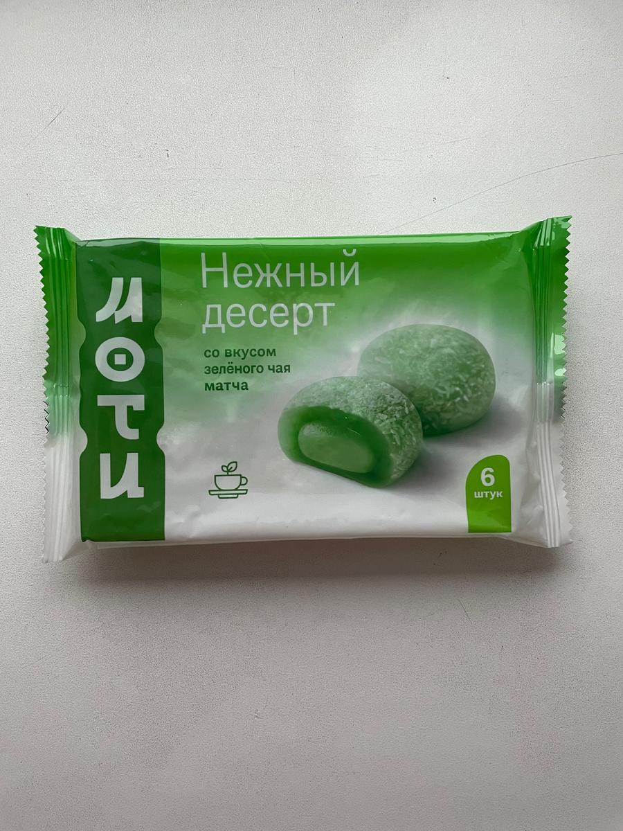 Не так давно начался прямо настоящий бум, связанный с пирожными Моти из рисовой муки. Ну а так как эти настоящие сладости изготавливают только в японских кафешках, то нам, не имеющим возможности туда отправиться, приходится довольствоваться некими подделками этой сладости. Самые дешёвые пирожные можно без проблем сейчас купить в Фикс Прайсе. Сначала я сильно сомневалось, стоит ли поддаваться всеобщему ажиотажу и бежать за ними туда. Однако потом любопытство все же взяло верх и я отправилась в известный магазин. Моти там продаются с двумя вкусами: манго и зелёный чай. На момент моего посещения Фикса в продаже был только зелёный чай матча, поэтому я купила упаковку именно с этим вкусом. Цена небольшая – всего 84 рубля. Но и сама упаковка тоже скромная. Там убирается всего шесть штучек. На этикетке сзади написан состав. Если вы его полностью прочитаете, то, возможно, пробовать эту сладость и не захотите. Очень много разных вредностей там. А в самой упаковке даже лежит маленький п