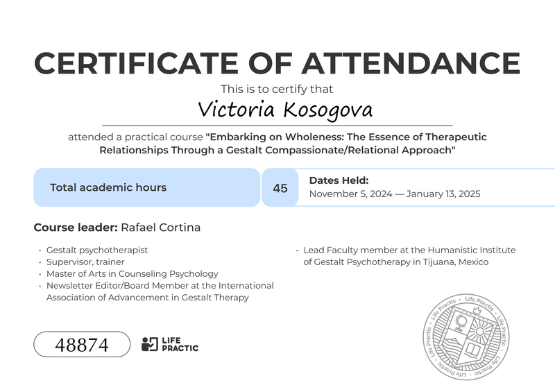 В январе я закончила потрясающий курс по клиент-терапевтическим отношениям от Рафаэля Кортины в Life Practic. Моя основная модальность - КПТ, но я большим удовольствием учусь у гештальтистов, а поучиться у них всегда есть чему. Реляционный гештальт предполагает равную, сотрудничающую позицию терапевта и клиента. Реляционный гештальт - это проживание эмоций в контакте с другим человеком (с терапевтом), проживание соматических ощущений (да, здесь много внимания уделяется телесности). И то как клиента замечает терапевт, как делится своим откликом, действует целительно. По сути - это практика присутствия в пространстве безопасных принимающих, здоровых отношений. Курс называется сложно "Обретение целостности: сущность терапевтических отношений через призму сострадательно-реляционного гештальт-подхода", но суть его проста: терапевтируют клиента не техники, ни терапевтическая модальность терапевта, а именно клиент-терапевтические отношения. Рафаэль Кортина вызвал огромное доверие уже после пе