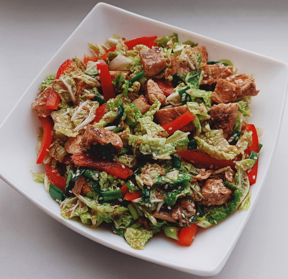 Азиатский салат с курицей, красным болгарским перцем и вкусной заправкой - это праздник для глаз и вкусовых рецепторов. Его яркие цвета, хрустящая текстура и взрыв вкусов сделают его звездой любого обеда или ужина. - Куриная грудка - 300 гр - Пекинская капуста - 60 гр - Красный болгарский перец - 90 гр - Зелёный лук - 30 гр - Семена кунжута - 15 гр - Сливочное масло - 20 гр - Молотый сушеный чеснок - по вкусу - Соль - по вкусу - Соевый соус - 8 ч.л. - Рисовый уксус - 8 ч.л. - Кунжутное масло - 8 ч.л. - Чеснок - 4 зубчика - Имбирь - 10 гр - Чёрный молотый перец - по вкусу 1. Куриную грудку разделите на части и посыпьте специями с обеих сторон (соль, черный молотый перец, молотый сушеный чеснок). 2. Чтобы придать курице нежный вкус и аромат, растопите на сковороде сливочное масло. Оно должно полностью растаять. 3. Аккуратно переложите кусочки курицы на разогретую сковороду. 4. Обжаривайте их с каждой стороны по 3–5 минут на медленном огне, чтобы мясо приобрело золотистую корочку и ост