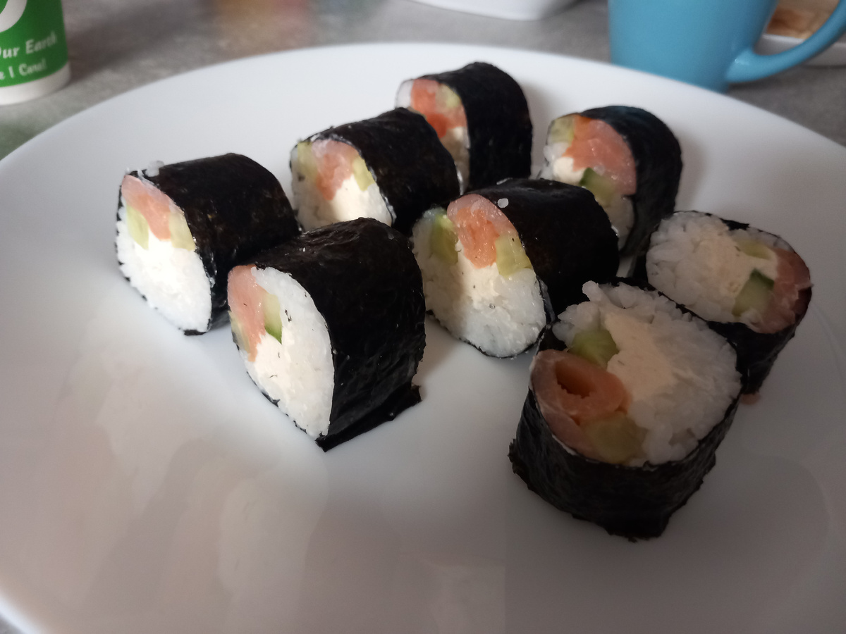Приветствую всех! Наслаждайтесь выходными! Ещё целый вечер впереди! Мне сегодня на работу, сейчас дома всех обедом накормлю и побегу 😃 Конечно же роллы, теперь пока не закончатся листы морской капусты, от меня не отстанут😃. Мужчинам еда посерьёзнее, котлеты. Хотела гречку на гарнир отварить, сказали не надо, просто котлеты и салат свежий. У меня сегодня шпаргелевый крем-суп из пакета. Хотела окрошки, но огурца мне не досталось😃, а магазины сегодня закрыты. По началу было очень не привычно, что по воскресеньям и официальным праздничным дням магазины не работают, но теперь привыкли. Бывает выпадают три праздничных дня подряд, значит три дня будут закрыты все магазины. Завтра с утра поеду закупаться и будет снова окрошка. Остатки корюшки запекла в аэро-гриле, тоже для себя, без соли. Что-то совсем не вкусно 🤭, макала в сметану. Подруга тортик испекла своему сыну на день рождения, такая красота, полюбуйтесь. Тоже захотелось сразу чего-нибудь испечь. Это она нас на новый год угоща