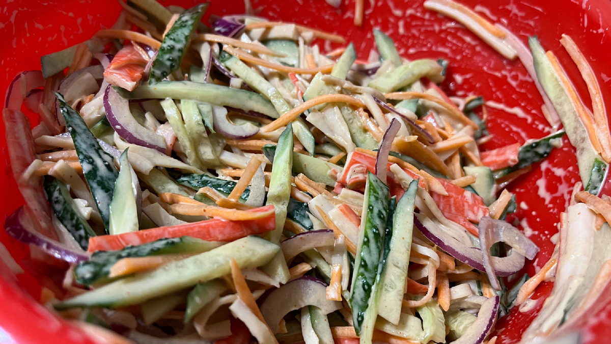 Ингредиенты: морковь - 1 шт огурец - 2 шт крабовые палочки - 1 упаковка красный лук - 1/2 шт Заправка: майонез - 2 ст.ложки соевый соус - 1 ст.ложка рисовый уксус - 1 ч.ложка красный острый перец - 1/2 ч.ложки Приготовление: Огурец, крабовые палочки и морковку нарезать соломкой. Красный лук - полукольцами. Все ингредиенты для заправке смешать и добавить в салат. Все хорошо перемешиваем и трескаем) Приятного аппетита 🤗❤️
