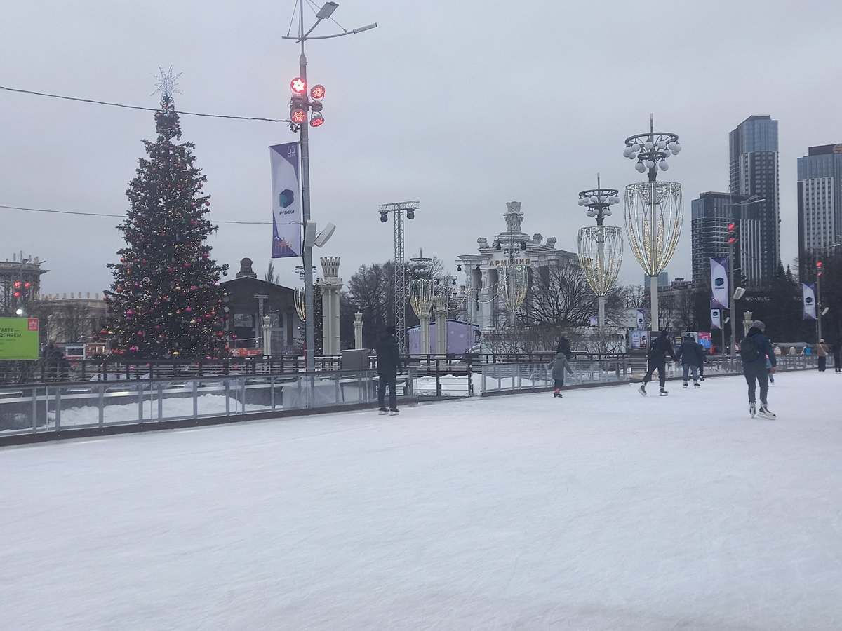 В это воскресенье наконец-то выбрались на каток на ВДНХ, впервые за зиму. Вернее, вообще на каток за эту зиму второй раз. Но новогодний каток в парке им. Горького совершенно не понравился отвратительным состоянием льда. Об этом уже писали. Интересно было сравнить лёд двух катков. К тому же там, в парке, приехали после сильного снегопада и ехали как по снежному полю. Но какой сейчас снег в Москве? Поэтому лёд блестел как стёклышко, а у бортиков даже немного подтаял. Но, как обычно зимой в Москве, как видите по фото, всё серое, ни проблеска солнечного луча. Даже прошлых лет смотрим фотографии, примерно тех же дней января, и так же всё серое, хмурое. По цене - в выходные 700 руб. взрослый билет, а это уже с 14 лет, но если покупать электронный билет по СПБ, то выходит почти на 100 рублей дешевле. Возьмите это на заметку. И в раздевалке видели информацию, что если брать коньки на прокат, то получишь бесплатный горячий напиток. Какой - не написано, но при выходе из павильона на лёд, с