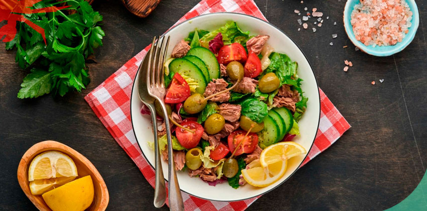 Ингредиенты: Слегка разминаем тунца вилкой. Нарезаем огурец ломтиками, а помидоры — крупными кусочками. Рвем листья салата руками. Смешиваем подготовленные ингредиенты. Добавляем оливки. Взбиваем вилкой лимонный сок, горчицу, масло, соль и перец. Заправляем блюдо. Приятного аппетита! Источник: https://wildcrab.ru/news?id=2648