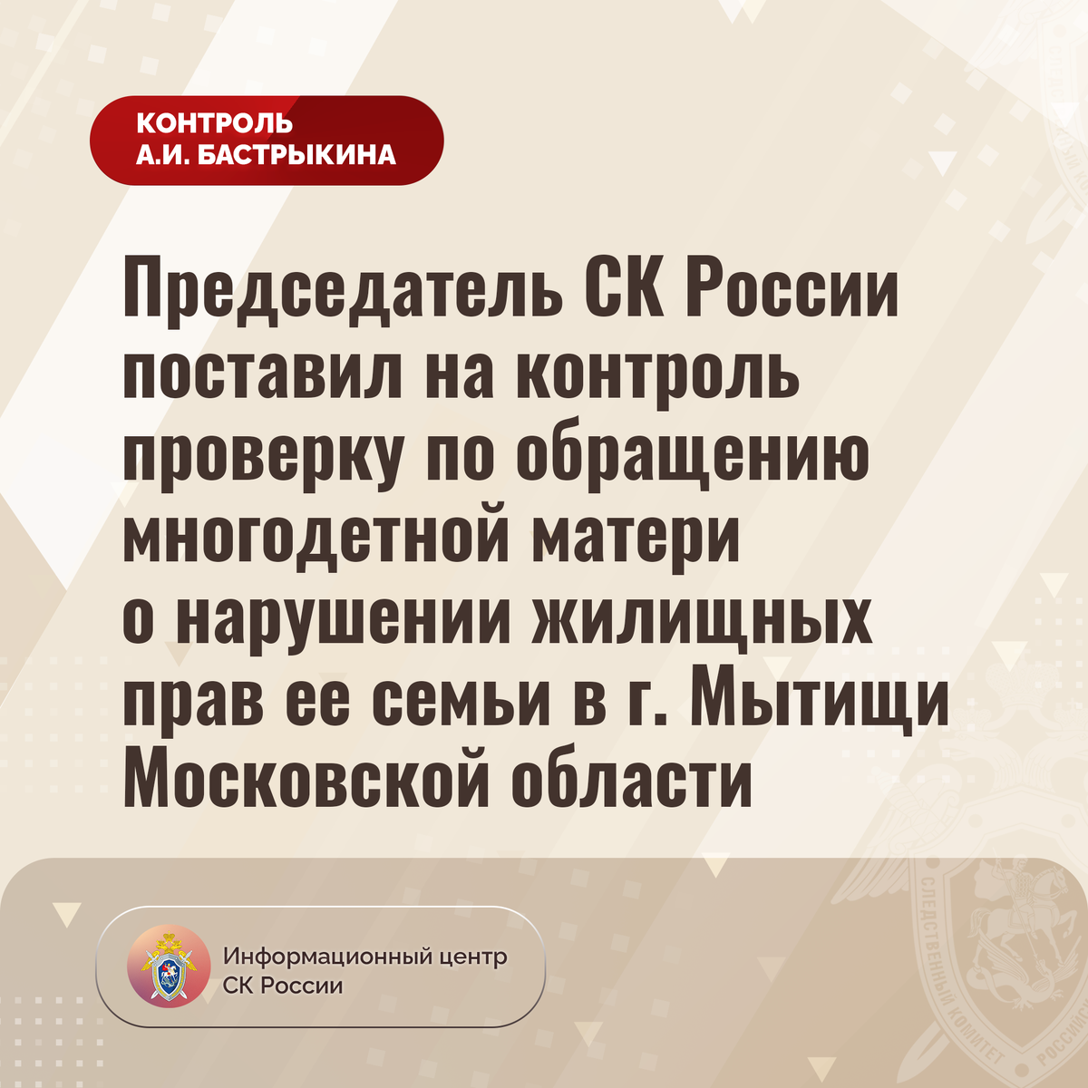 Председатель СК России поставил на контроль проверку по обращению многодетной матери о нарушении жилищных прав ее семьи в г. Мытищи Московской области В комментариях в аккаунте приёмной главы СК России А.И. Бастрыкина «ВКонтакте» обратилась многодетная мать из города Мытищи Московской области. С 2012 года семья заявительницы, имеющая на иждивении пятерых детей, состоит на специализированном учете и ожидает получения положенного по закону жилья или земельного участка для возведения домовладения. Однако мер к реализации прав граждан не принимается, очередь не движется. Многочисленные обращения в различные инстанции результатов не принесли. В ГСУ СК России по Московской области по доводам комментария начата процессуальная проверка. Председатель Следственного комитета Российской Федерации Александр Иванович Бастрыкин поручил и.о. руководителя ГСУ СК России по Московской области Ярославу Александровичу Яковлеву представить доклад о предварительных и окончательных результатах процессуальной