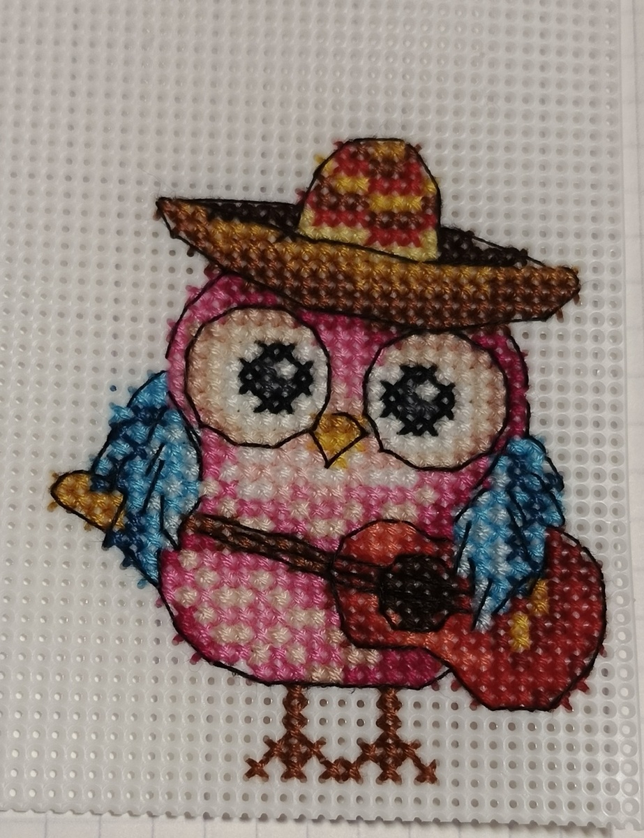 А у меня сегодня первый маленький финиш этого года. Совушка с гитарой от Жар-птица. На наборе название "магниты". 126 стежков бекстича. Получилась намного ярче, чем на превью. Ноты вокруг совушки вышивать не стала.