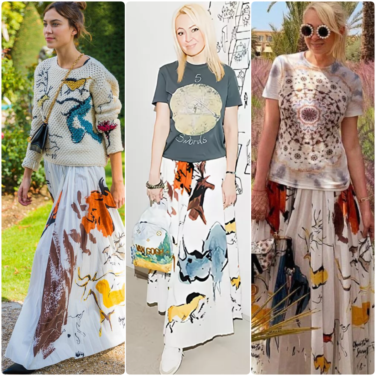 Яна Рудковская, российская продюсер и светская львица, часто оказывается в центре внимания благодаря своим стилевым решениям. Анализируя её наряды, нельзя не заметить, что некоторые из них уже были замечены на мировых знаменитостях. 🤩 Некоторые критики пускают в ход язвительные комментарии, утверждая, что Яна «бесстыдно копирует» образы звезд. Но давайте взглянем на это с другой стороны! На мой взгляд, все мы можем позволить себе носить то, что нам нравится, даже если это напоминает наряды других. Яна обладает потрясающей фигурой, что позволяет ей выглядеть великолепно в платьях с подиумов. Давайте же оценим, кто выигрывает в этой модной битве! Лук 1: Белая юбка в пол Dior — кто лучше? Первый лук, который стоит обсудить, - это белая юбка в пол от Dior с ярким принтом. На Яне Рудковской она была дополнена довольно простыми футболками с принтами. В это время Алекса Чанг выбрала смелый свитер с узорами в виде животных. Обе девушки выглядели шикарно, однако коллекция Dior, из которой юбка