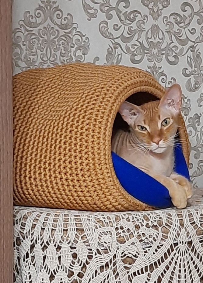 Владельцы котеек покупают для своих питомцев лежанки или домики. Бывает, что котейке не нравится купленный домик. Хотя домик красивый и уютный. Я думаю, что причина в характере кота или кошечки. Кузя очень любил закрытый домик. А вот кошечка Лика не любит закрытые домики. Она предпочитает лежанки. Когда Лика выросла, лежанка стала ей маленькой. Она облюбовала корзину. Поэтому я решила связать для Лики большую лежанку в форме корзины. Вязала не по спирали (закрывала каждый ряд). Узор кожа дракона. Узор плотный и хорошо держит стенки Предлагаю план по вязанию лежанки Связать круг узором "в раскол" (у меня диаметр 40см). Первый ряд подъема стенок (за заднюю полупетлю и перемычку) 2 ряд чередуем столбик без накида и рельефный лицевой столбик без накида 3 и последующие ряды вяжутся аналогично. Столбики без накида и рельефный вяжутся в шахматном порядке (видео представлено ниже) Лежанка готова. Осталось сшить матрасик. матрасик для кошки https://dzen.ru/a/Z5cpz61Ahm8dWedu