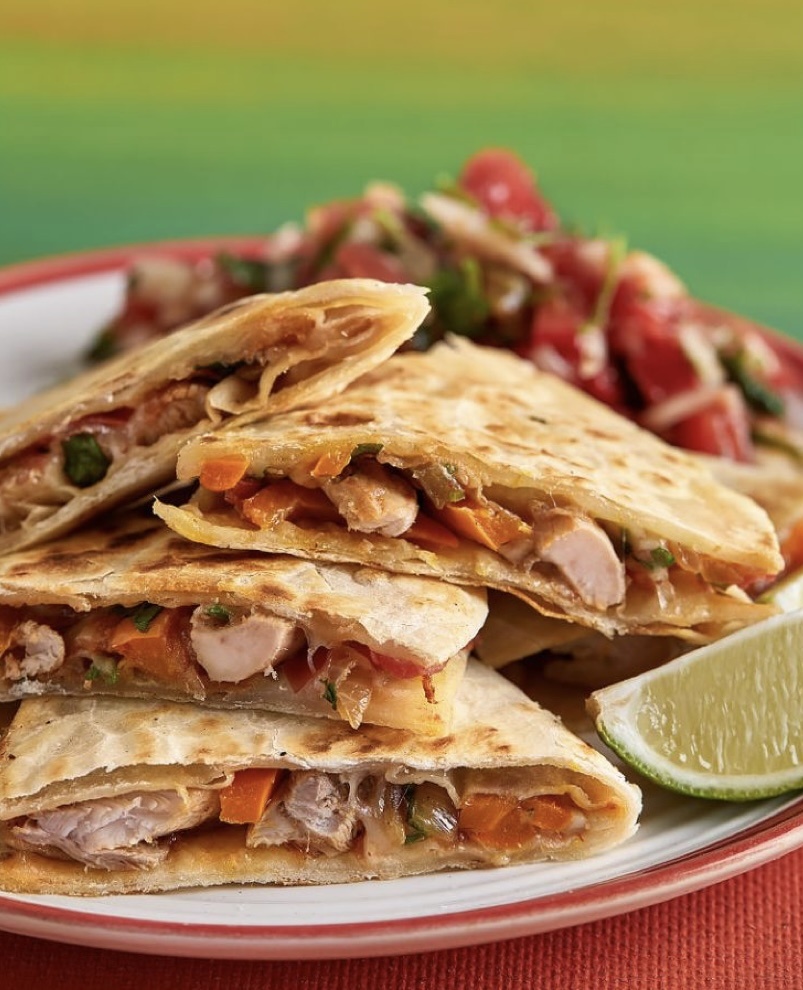 Кесадилья — популярное мексикан-ское блюдо, представляющее собой тортилью с начинкой, обжаренную до хрустящей корочки. Основным ингредиентом начинки является сыр, который при нагревании плавится, придавая блюду особую сочность. Дополнительно можно использовать мясо, птицу, овощи и специи. Ингредиенты: Пошаговое приготовление: 1. Подготовка ингредиентов: 2. Приготовление начинки: 3. Сборка кесадильи: • На половину каждой тортильи выложите часть тертого сыра. • Сверху распределите приготовленную начинку и посыпьте оставшимся сыром. • Сложите тортильи пополам, накрыв начинку свободной половиной. 4. Обжаривание: • Разогрейте чистую сковороду на среднем огне. • Выложите кесадильи на сухую сковороду и обжаривайте по 2-3 минуты с каждой стороны до золотистой корочки и расплавления сыра. 5. Подача: • Готовые кесадильи нарежьте на сегменты и подавайте горячими с соусом сальса, сметаной или гуакамоле. Кесадилья - универсальное блюдо, позволяющее экспериментиро