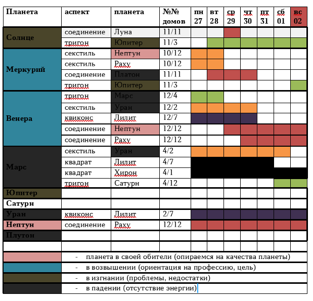 Читая прогнозы на неделю, сразу трудно оценить вкупе, насколько период будет благоприятным или негативным. Для себя я делаю специальные таблицы, чтобы легче ориентироваться в днях недели. Вот решила и с вами поделиться этим материалом. В таблицах я использую цветовую заливку – для гармоничных аспектов приятные оттенки, для напряженных, соответственно, скучные краски. Думаю, вам не сложно будет разобраться, какие оттенки каким аспектам принадлежат. Чем больше приятных красок, тем гармоничнее неделя. Обратите внимание! Гармоничность аспектов может оказаться условной из-за того, что планеты находятся в невыгодных позициях. Это тоже отображается определенным цветом. В таблице 1 нет аспектов Луны. Так как ночное Светило не сидит на месте и активно влияет на нашу жизнь, планета достойна отдельной таблицы. Есть еще таблицы под номером 3 – на каждый день недели. Они помогут вам в планировании дел. Вы можете сохранить информацию у себя на рабочем столе, а можете распечатать, чтобы таблицы всегд