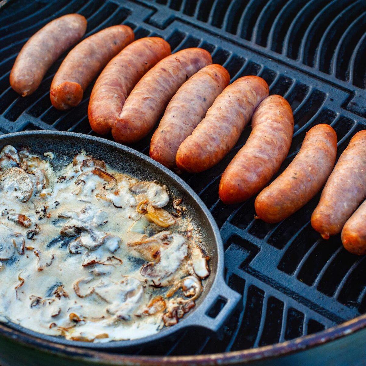 Приветствую, друзья! Сегодня мы с вами коптим колбаски в угольном гриле. Не знаю, что может быть вкуснее и проще😉 Кстати, я спрашивал у многих своих друзей, как они готовят колбаски или купаты на гриле, и чаще всего слышал про обычный способ обжарки, но как только я угощаю их копчеными колбасками, то к привычному способу возвращаться не хочется😍 Разогреваем гриль до 130 градусов и отправляем колбаски в зону непрямого жара, добавляем щепу и коптим порядка 20-25 минут🔥 Для колбасок я сделал очень простой сливочный соус с грибами: Нарезаем лук и грибы, обжариваем до готовности и добавляем нежирную сметану, мешаем соус, пока он хорошенько не загустеет. Соус готов и он просто шикарен🔥 Свиные колбаски я слегка обжарил после копчения на прямом жаре, но они и так уже были готовы после копчения🔥 Добавляем соус к колбаскам и наслаждаемся😍 Приятного аппетита, друзья😉🥩
