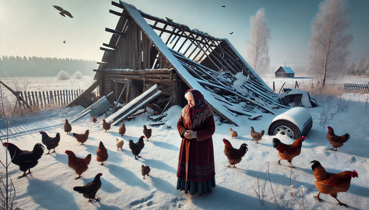 Подойдя к курятнику, бабушка остановилась. Вид обрушившейся крыши только усилил её тревогу. Доски валялись в снегу, словно осколки разбитой игрушки. Она приоткрыла дверь. Тишина. Там, где обычно раздавалось довольное кудахтанье, теперь царило ледяное молчание.