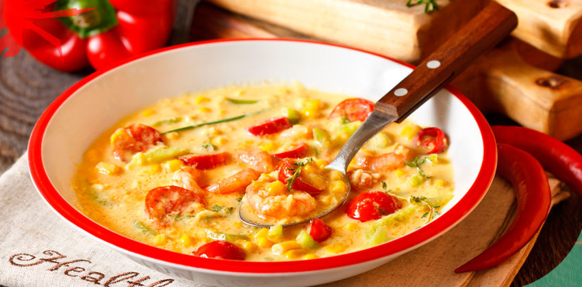 Ингредиенты: Светлую часть порея нарезаем половинками колец, сельдерей — небольшими кусочками, черри — половинками. В кастрюле разогреваем масло на среднем огне. Обжариваем лук с сельдереем за 3–5 минут. Добавляем кукурузу вместе с жидкостью из банки и заливаем горячей водой. После закипания провариваем 5 минут. Добавляем в суп черри и креветки, слегка присаливаем и посыпаем тимьяном. Варим ещё 3–4 минуты. Добавляем тёплые сливки, перемешиваем, доводим до кипения и снимаем с огня. Блюдо готово. Приятного аппетита! Источник: https://wildcrab.ru/news?id=2653