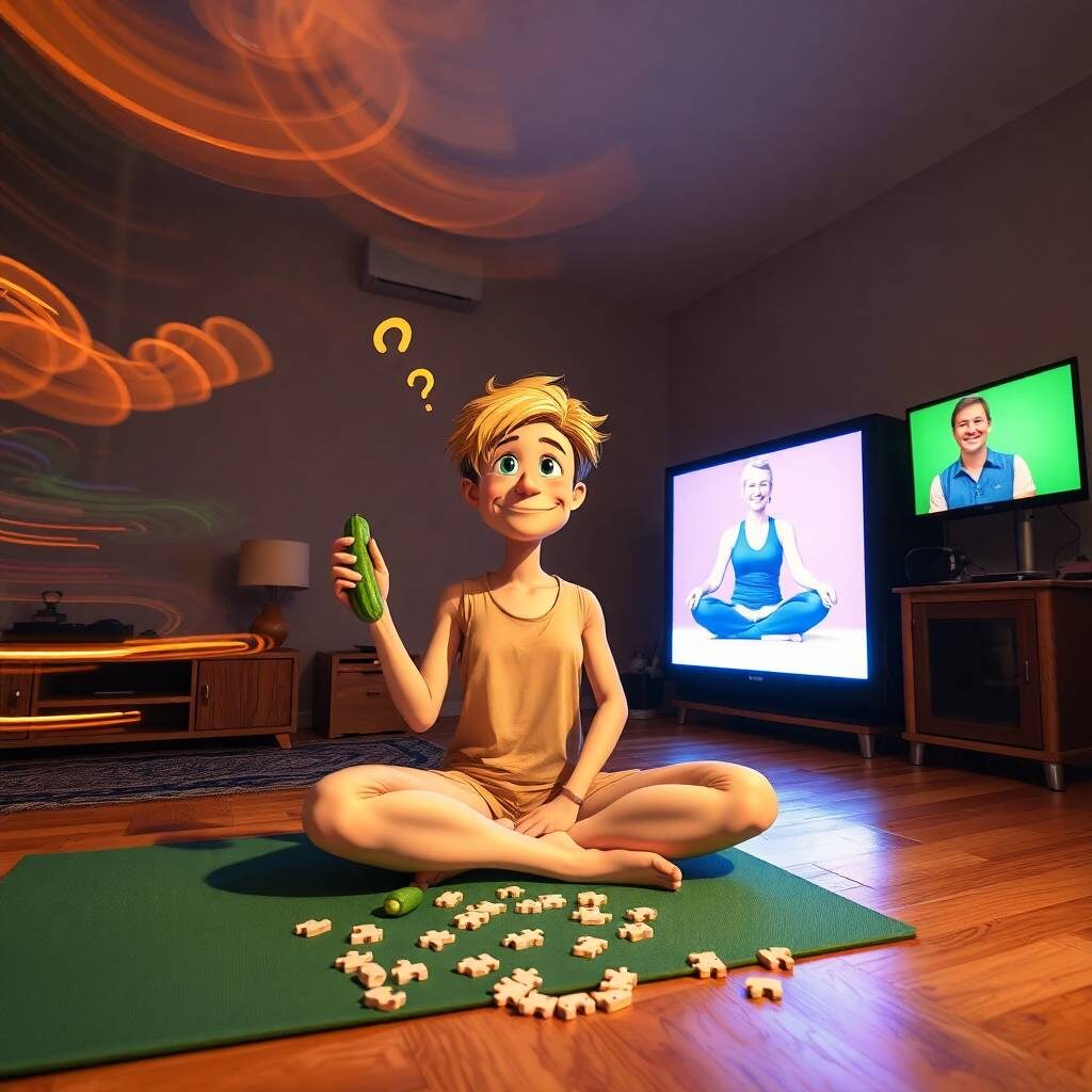 Включаю видеоурок, смотрю, как этот инструктор в экран улыбается. Он такой: “Теперь расслабьтесь, почувствуйте своё дыхание”. И вот я стою в позе треугольника, мне уже хочется умереть, а он всё улыбается и говорит: “Отлично! А теперь попробуем немного растянуться”. Да куда уже больше растягиваться? Я и так чуть не разорвался! Но знаете, я не сдаюсь. Думаю: “Окей, с дыханием понятно, теперь займусь питанием”. Начал изучать всякие правильные диеты. Открыл статью, а там написано: “Ешьте только натуральные продукты”. Хорошо. Иду в магазин, беру огурец, читаю на упаковке: “Без ГМО, натуральный, фермерский”. Прекрасно. Прихожу домой, кусаю — а он на вкус как пластиковая бутылка. Теперь думаю: а может, это была не еда? Может, это была но