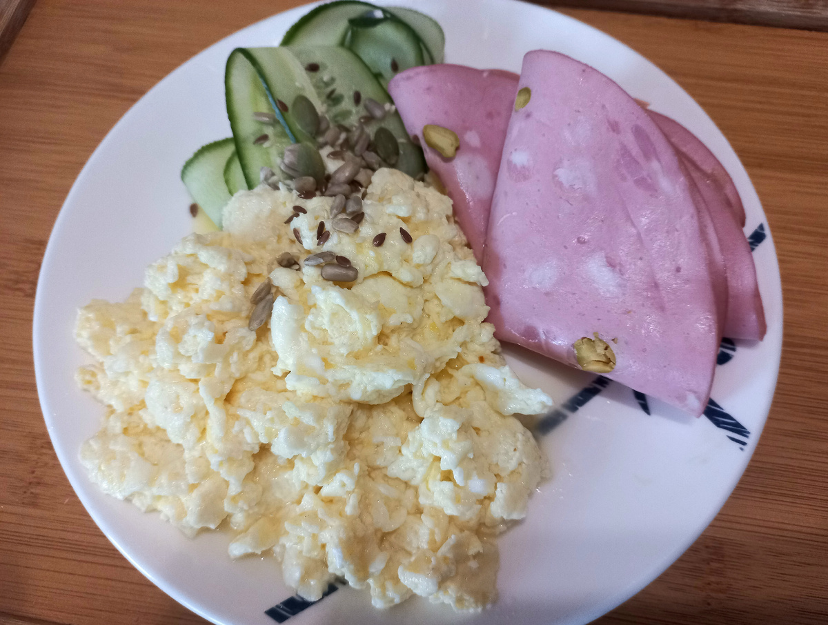 Сегодня - скрембл, мортаделла и огурчики с семечками.