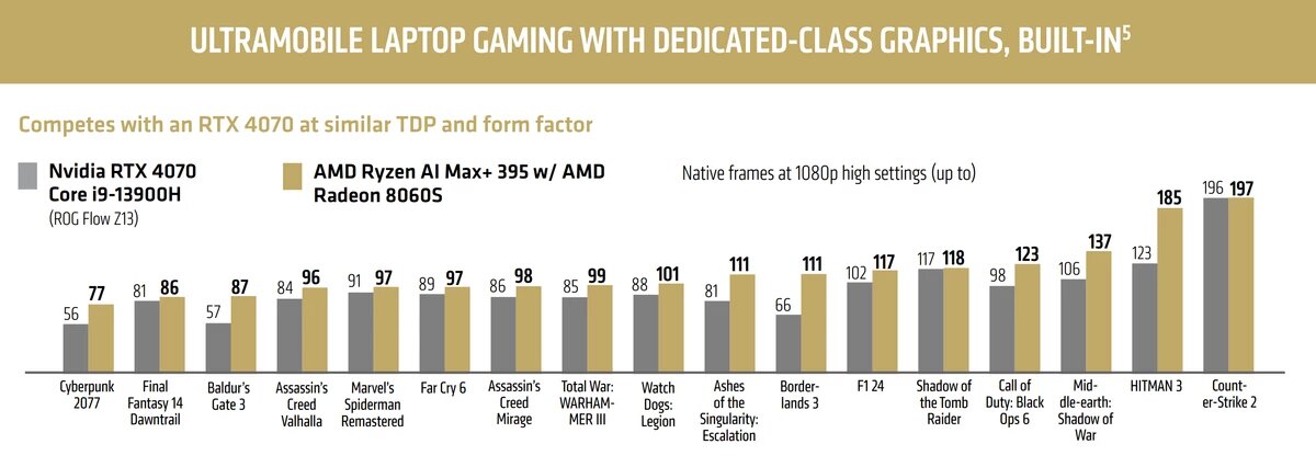 Компания AMD поделилась игровыми бенчмарками своих новых процессоров Ryzen AI Max+ 395. В частности, разумеется, речь идет о тестах их встроенной графики Radeon 8060S, которая уничтожает в игровых тестах дискретную RTX 4070 при схожих показателях потребления и форм-факторе устройства. Тесты проводились в разрешении 1080p в планшете ASUS ROG Flow Z13. Напомним, что TDP Ryzen AI Max+ 395 может варьироваться от 45 до 120 Вт в зависимости от настроек со стороны производителя. Эти же процессоры AMD также будут использоваться в более крупных ноутбуках и даже настольных ПК от множества производителей.