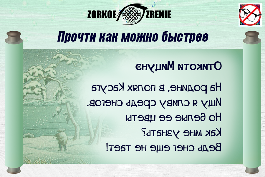 Прочти написанное наоборот японское пятистишие! Если при этом сознательно активизировать логическое ядро, например, постараться запомнить небольшой рифмованный текст, то нейронные «зрительные сети» взаимодействуют с другими участками мозга, восстанавливая и поддерживая всю зрительную систему целиком. Зрительные зоны мозга активизируются, и это способствует быстрейшему восстановлению зрения! Ответьте, как у вас получилось: Я был(ла) в затруднении! Я прочёл(ла) свободно! Я прочёл(ла) и могу рассказать суть прочитанного! Я прочёл(ла) и запомнил(ла) стих!