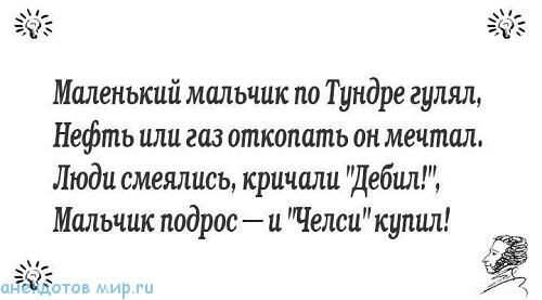 Помните такой "народный" советский жанр, как "садистские стишки" о похождениях маленького мальчика? Ой, это уже из постсоветского времени. Почему бы нам не осовременить этот жанр, применительно к текущим событиям? Вот, например, в Китае 10-летний школьник, которому "прилетело" дома за несделанную домашку, сдал полиции родного отца за хранение наркотиков. Теперь на папаню возбудили уголовное дело. В нашем жанре, данная новость будет звучать следующим образом. "Маленький мальчик "двояк отхватил", ремня от папани он получил. Долго над шуткой смеялась вся "хата" - за наркоту оказался там папа". Или, вот эта новость, в которой Сергей Миронов предлагает «вернуть» Аляску в обмен на замороженные российские активы на сумму $16,2 млрд. "Маленький мальчик с трибуны пищал, нашу Аляску домой возвращал. Все эскимосы в момент онемели, срочно в Россию они захотели!". В Беларуси, тем временем, проходят самые честные в мире президентские выборы (даже честнее, чем в РФ) с абсолютно непредсказуемым резуль
