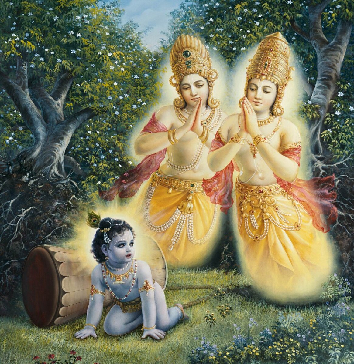 В какой-то момент деревья надломились и повалились во двор. А из деревьев вышли две прекрасные сияющие фигуры мужчин, они склонили перед Кришной голову и преклонили колено, а после исчезли в вышине.