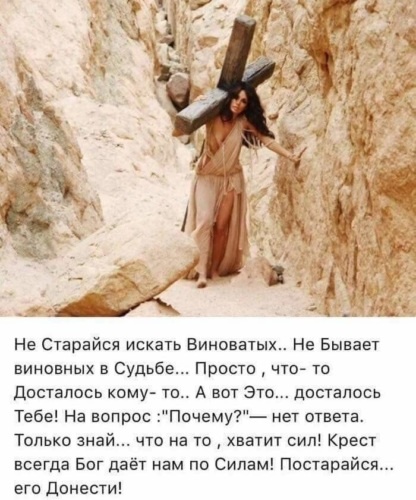 Ты богат? - Неси крест свой так, чтобы богатство твоё (данное тебе Господом) некоторой частью служило и другим. Ты беден? - Неси, и не будь занудой... И не смотри на чужое, - ибо это есть твой крест. Уразумей: Главное богатство - это твоя Вера. Не растеряй её в пути своем. Ты грешен? - Помни, - что и ты взял и несёшь Крест, на котором coрaспяты все грехи человеческие - в том числе и твои... Ты без ног? - Но Ник Вуйчич и без ног и без рук. Важно другое... - Чтобы дела твои и мысли твои шли рядом с Христом и для других стали назидательными. Ты болен? - Возьми горчичное зерно и посей его в твоем сердце. Оно прорастёт живительной силой через крест и исцелит тебя. Ты устал? И порой нет сил? - Но это всё плоть твоя шепчет тебе... Не верь ей,- но Богу доверься в молитве... С Ним преодолеешь любую усталость. Ты не веруешь? - И поэтому считаешь крест бесполезным в твоей жизни? Не торопись с выводами... Ибо без него путь ведёт туда, где всё тленно... Но о