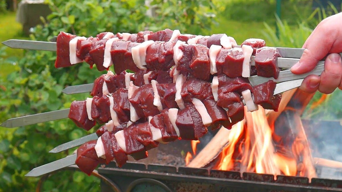 - Отправляйте шашлык на раскаленные угли. Я жарю печенку на мангале от 5 до 10 минут. В процессе жарки непрерывно вращайте шампуры до готовности печени.