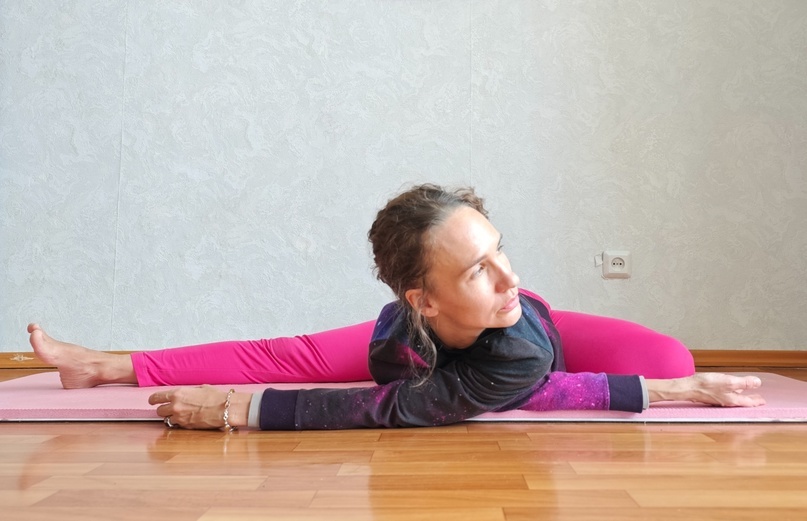 - Продолжайте разводить ноги, пока таз не опустится на пол (при недостаточной растяжке оставайтесь в полушпагате).