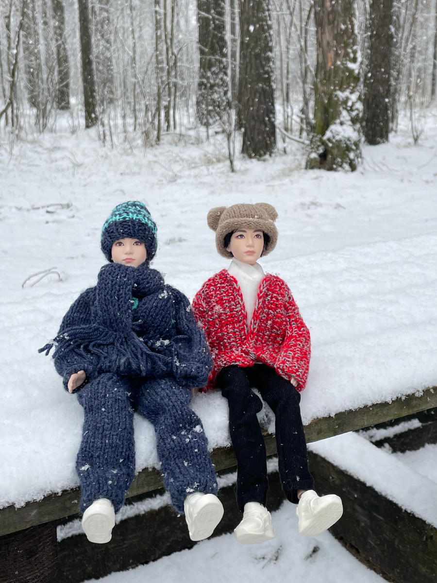 У ребят было в планах встать пораньше в воскресенье и устроить фотосессию на зелёной февральской травке. Но погода совершенно непредсказуема - неожиданно решил пойти снег. Да ещё как пойти! Но не менять же планы! Поездка в лес состоится при любой погоде. Кажется весна немного откладывается… -Тэхёни-хён, смотри сколько снега! Зимняя сказка! -Тэхёни-хён, тут кажется обрыв, а внизу озеро. Оно почти замёрзло! -Чонгуки, осторожно! Тут очень скользко! Не упади!Я издалека полюбуюсь. А вид и правда шикарный. А снег всё шёл и шёл, и не думал останавливаться… И такая тишина вокруг…Даже хотелось разговаривать вполголоса, почти шёпотом. От зимней красоты леса было глаз не оторвать… -Тэхёни-хён, давай лепить снеговика Снеговик получился похожим на Тэхёни-хёна) -Чонгуки, как хорошо, что мы сегодня на прогулку выбрались.. А снег вдруг перестал сыпать, и ребята углубились в лес.. -Уже такие сугробы! Тут скользко! Тэхёни-хён, давай лапу, а то упадёшь ) Неожиданно под снегом обнаружился брусничник.