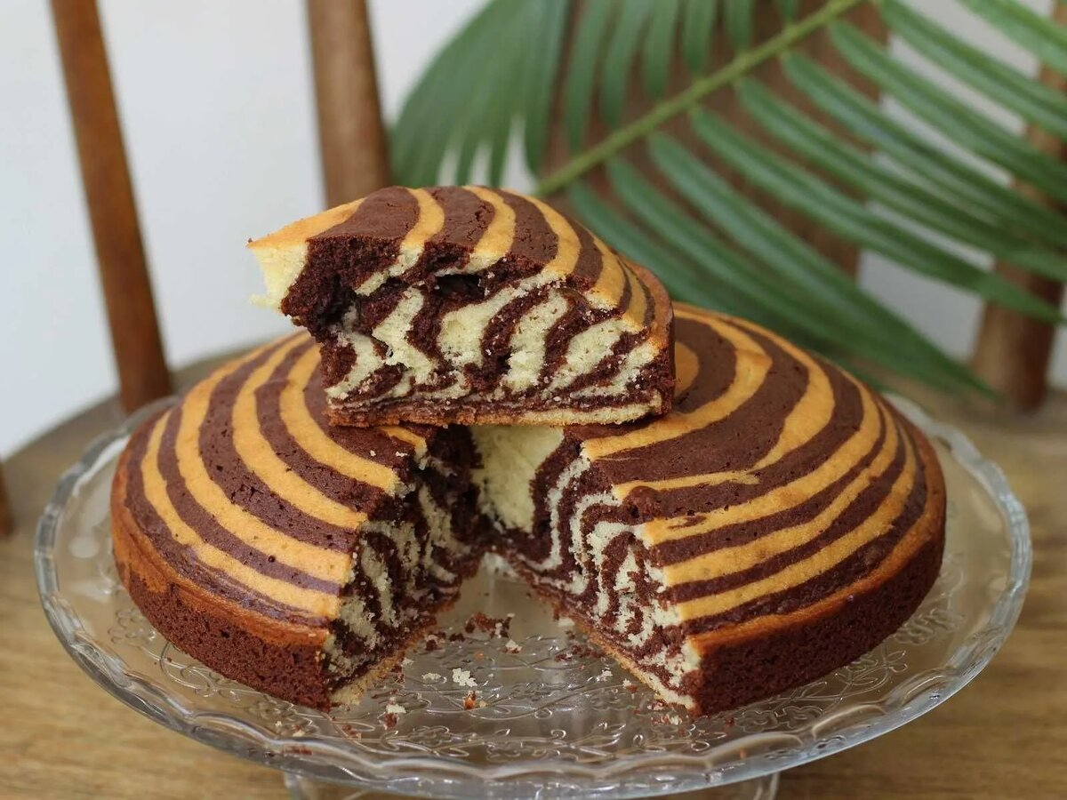С помощью зубочистки или ножа сделайте легкие разводы от центра к краям формы, чтобы создать рисунок “зебры”. - Выпекание кекса:Выпекайте кекс в разогретой до 180°C духовке 35-40 минут, или пока он не станет золотистым и деревянная шпажка, вставленная в центр, не выйдет сухой.