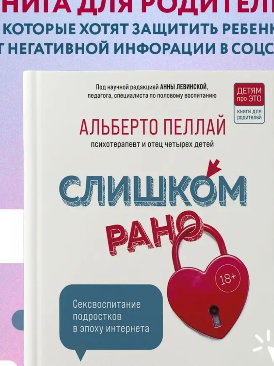 В современном мире, где информационные технологии и интернет стали неотъемлемой частью повседневной жизни, вопросы сексуального воспитания подростков приобретают особую актуальность. Подростковый возраст — это период, когда молодые люди начинают осознавать свою сексуальность, формировать отношения с окружающими и сталкиваться с различными вызовами, связанными с их физическим и эмоциональным развитием. В условиях, когда доступ к информации стал практически безграничным, родителям необходимо не только быть в курсе происходящего, но и уметь вести открытые и доверительные диалоги со своими детьми. Книга Альберто Пеллая "Слишком рано! Сексвоспитание в эпоху Интернета" представляет собой важный ресурс для родителей, стремящихся к эффективной коммуникации с подростками по вопросам сексуального воспитания. Альберто Пеллай, известный психотерапевт и отец четверых детей, делится в своей книге собственным опытом и практическими наблюдениями, что делает его рекомендации особенно ценными и актуал