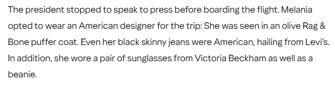 «Мелания выбрала для поездки одежду от американского дизайнера. Она надела оливковый пуховик от ,,Рэг энд Боун". И даже её чёрные джинсы-скинни - американские, от ,,Левайс"». *** В пятницу Мелания Трамп вылетела в Северную Каролину вместе со своим мужем, президентом Дональдом Трампом. Интернет-издание Yahoo!Life так описало выбранный ей наряд: Melania opted to wear an American designer for the trip: Перевод: «Мелания выбрала для поездки одежду от американского дизайнера». А именно: puffer coat - пуховик skinny jeans - джинсы-скинни (в обтяжку) a pair of sunglasses - солнцезащитные очки a beanie - шапочка (как для плавания, но тёплая) А на ногах: For shoes, Melania Trump wore a pair of black faux leather combat boots from Xappeal. Перевод: «В качестве обуви Мелания Трамп надела пару черных армейских ботинок из искусственной кожи от Xappeal». shoes - обувь, туфли combat boots - армейские ботинки Подробнее про выбранные бренды можно прочитать на канале "Гламбокс" - ссылка в закреплённом к
