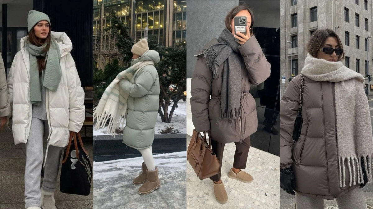 Важный момент! Смотрится лучше, если шарф немного светлее пуховика, на пару тонов. Особенно, если цвет верхней одежды темный. Получится гармоничный, спокойный образ.