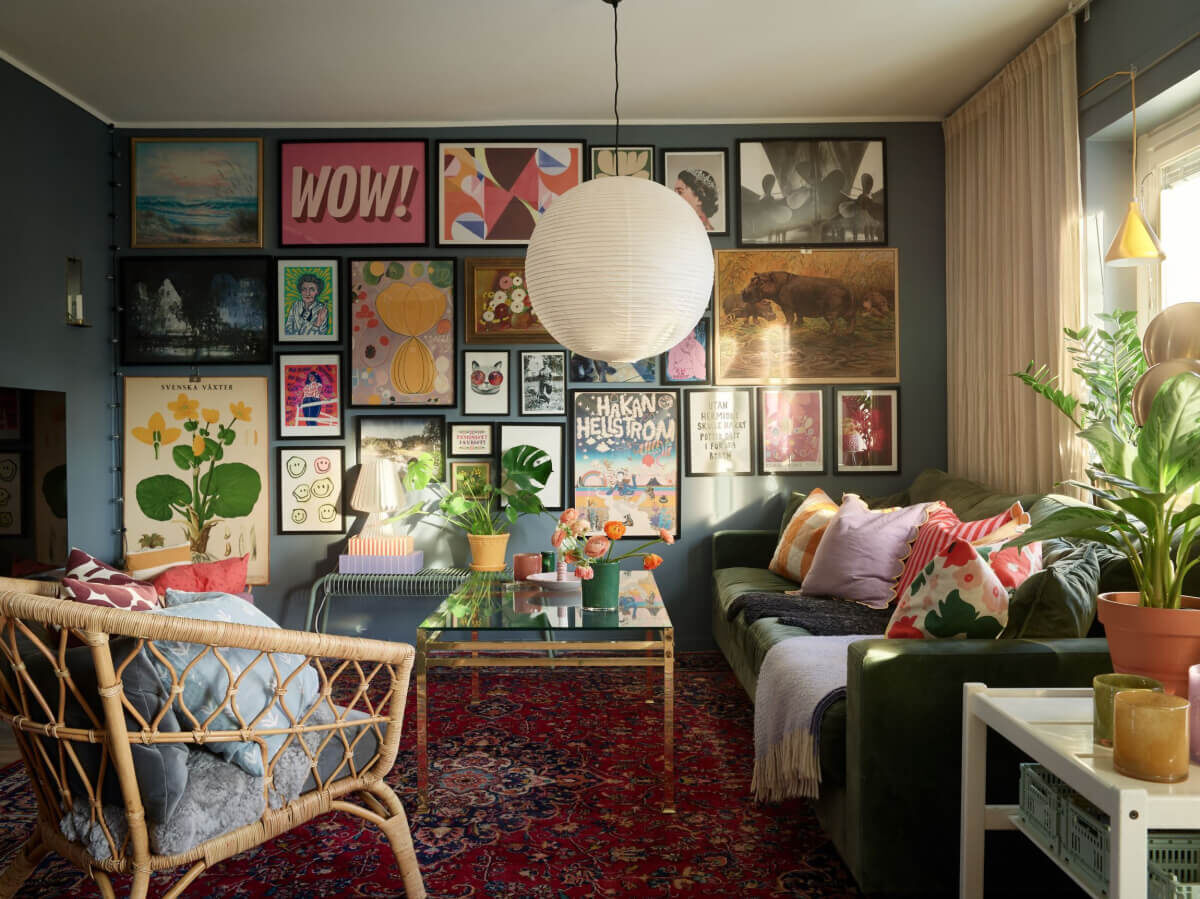 В бывшем доме престарелых 1940-х годов в Стокгольме расположена эта замечательная двухкомнатная квартира, где гармонично сочетаются цвета, стили, материалы и узоры, создавая уютный интерьер. Площадь квартиры составляет всего 56 квадратных метров, но благодаря продуманному дизайну пространства она кажется значительно больше. Каждая комната оформлена в своей уникальной цветовой палитре и украшена множеством постеров, многослойных текстильных элементов и зелени, что создаёт привлекательную атмосферу. Здесь возникает желание остаться и почувствовать себя как дома. Насколько это уютно? Гостиная окрашена в глубокий синий оттенок (Jotun's 'Sky Blue'), который сочетается с более яркими цветовыми акцентами в искусстве и текстиле. Большой персидский ковёр добавляет глубину цвета в комнату и создаёт уютную атмосферу. Комнаты можно покрасить в тёмный оттенок благодаря двум окнам, выходящим на юг, которые обеспечивают много естественного света в гостиной. Одна стена превращена в фантастическую гале