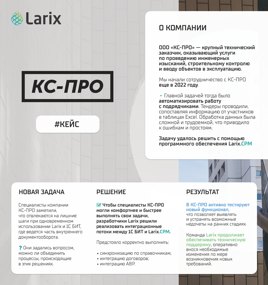 Мы всегда идём навстречу нашим заказчикам и адаптируем свой продукт под их потребности. Создание индивидуальных модулей — частая задача, возникающая перед разработчиками Larix. В рамках сотрудничества с компанией «КС-ПРО», мы провели интеграцию 1С БИТ с решением Larix.CPM. ООО «КС-ПРО» — крупный технический заказчик. Компания проводит инженерные изыскания, осуществляет подготовку проектной документации, строительный контроль, организацию строительства со сдачей объекта в эксплуатацию. Ранее мы помогли компании автоматизировать работу по выбору подрядчиков, а также организации и проведению торгов. Подробнее об этом вы можете почитать здесь. В настоящий момент компания «КС-ПРО» активно применяет решение Larix.CPM в своей работе. Однако часть внутреннего документооборота ведется в достаточно популярной системе учета и хранения данных 1С. Специалисты компании заметили, что отвлекаются на лишние шаги при использовании этих двух решений. Они задались вопросом, можно ли объединить процессы, п