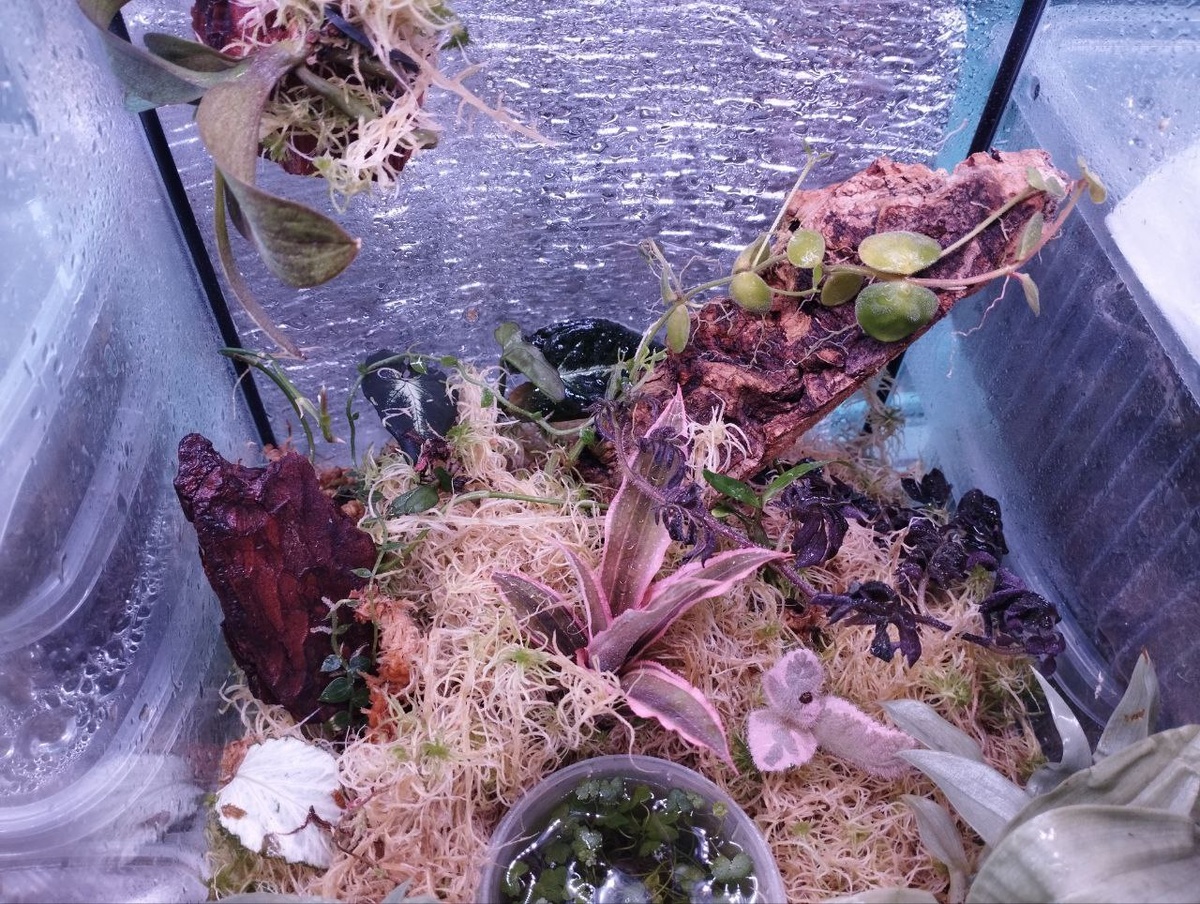 Прополола флорариум. Надо его совсем разобрать. Все же принцип "напихала что было" я начинаю перерастать. Хочется упорядоченности и красоты, а не салата и разноцветья. Придумалась эта банка не помню когда и даже не смогла найти исходные фото. На дно было уложен свежий мох из леса, утрамбован, сверху попышнее, ну и растений туда что было. Дисхидия астефана была на последнем издыхании, где-то я ошиблась с уходом, ну и банка еë уже не спасла, к сожалению. Перед прополкой оно выглядело вот так Волевым решением я срезала эписцию. Ну не для 15 литровых банок это растение Нашла в глубине пару криптантусов. Один убрала. Вообще не помню это откуда. Наверно, деть моего коричневого Обрезала разросшийся мох, мелкие плети аквариумной забыла кого и фиолетового соланума улеанум. Стало больше пространства. Но скорее всего эта банка тоже будет разобрана. Бестолковая получилась. Акварельной эписции все-равно не нравится. Соланум затягивает всю площадь. Разве что криптантусу нравится, корнями вроде д