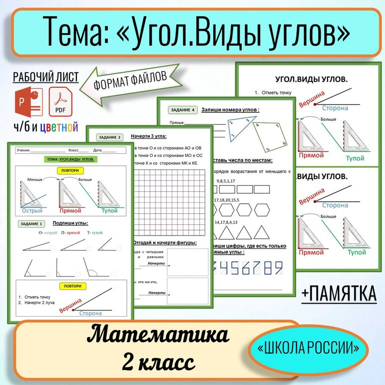 Рабочий лист " Угол. Виды углов. " Математика 2 класс с ответами для учителя + Памятка Для закрепления или для проверки знаний