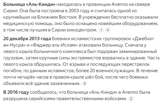 Вот тут я вам нашла справку о том, в честь кого была названа эта алеппская больница. В честь средневекового философа. В этом, кстати, вся Сирия, которую мы потеряли. Сирия, где помнили и гордились наукой, искусством, достижениями в архитектуре, поэзией и литературой... Больницу даже не в честь средневекового врача, а в честь философа назвали. А раковый центр в Дамаске получичл имя Бируни - средневекового астронома и географа.