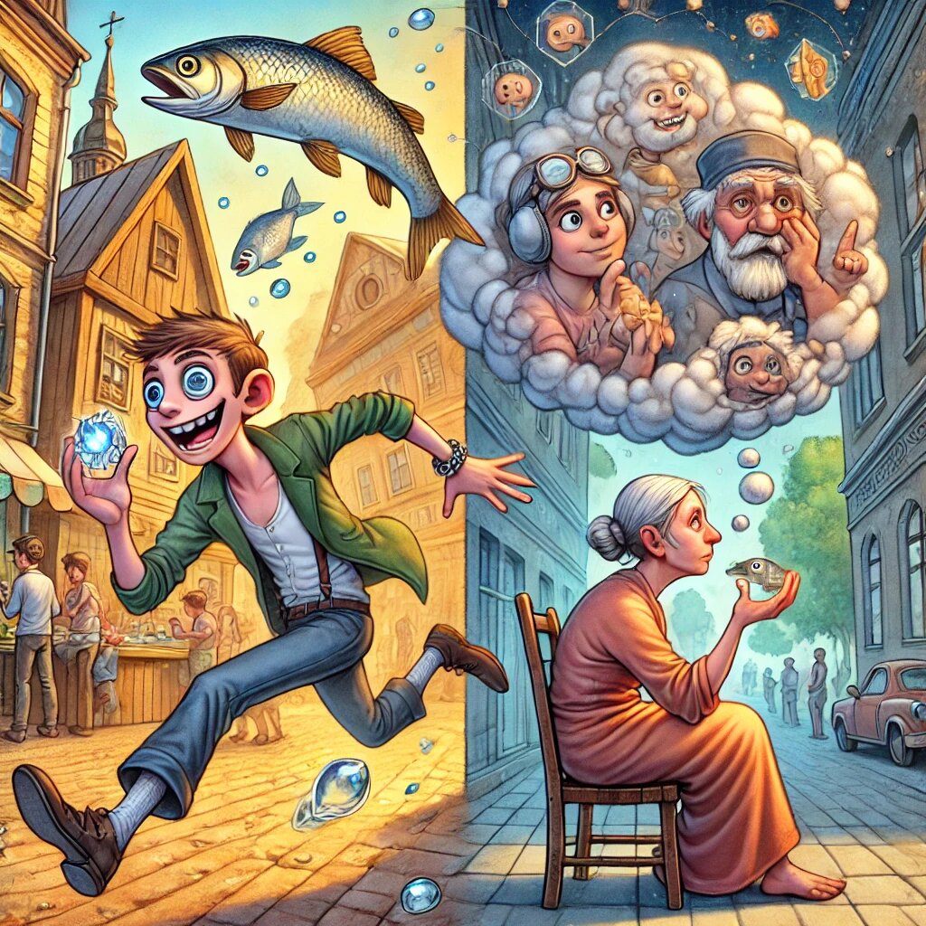 Марсик был свободен от лишнего веса, комплексов, предрассудков и зависимостей, поэтому бежал довольно легко и быстро. Кто-то пытался схватить его, но Марсик быстро вырвался и оказался вне рынка. Он ловко лавировал между прохожими и быстро ушёл от погони. Крики позади отдалились, но он продолжал бежать, держа рыбу во рту и даже не думал взять ее в руки.